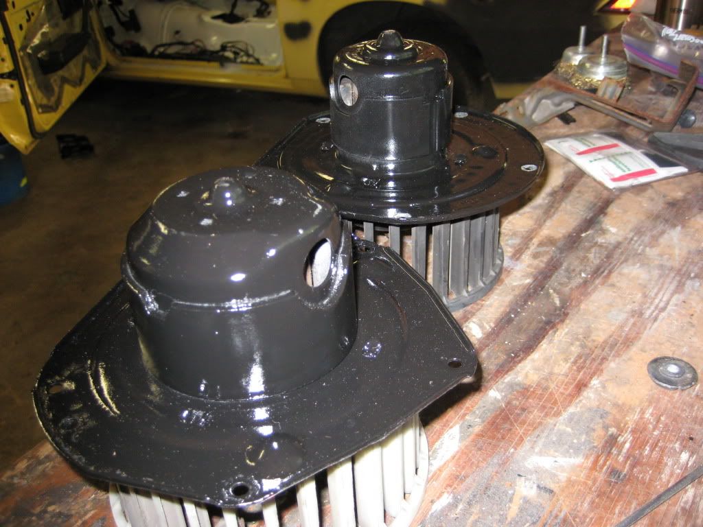 The delete motor has the black cage, the aircon one has the white cage. As you can see the shaft for the aircon motor is much longer than the delete shaft. The aircon cage has very long blades, too long to fit in the delete box. You need to hit up FWD cars in the junkyard till you find a cage like the white one in the pic with short blades and the provision for the long driveshaft.