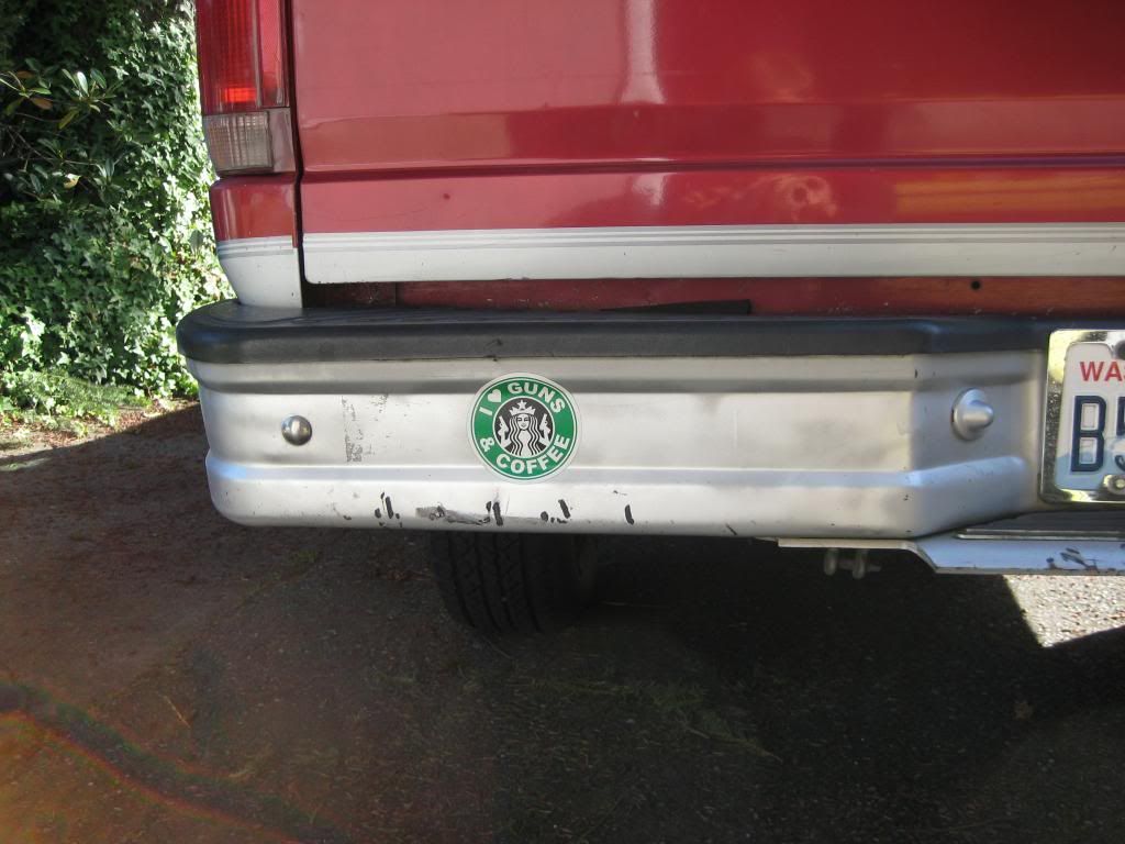 There's an easy fix for that bumper sticker. Just cut it across the center and peel off the bottom part.  |