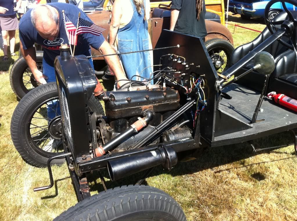 I really like that 4 cyl. flatty roadster thing as well. Do you have any pics of the other side of the firewall? Looks like the plug wires go up and dead-end there with no distributor? Coil pack car maybe? Craziness.