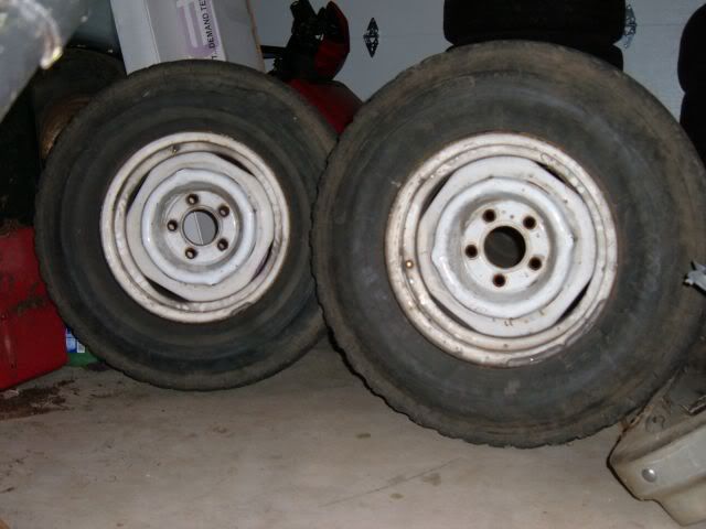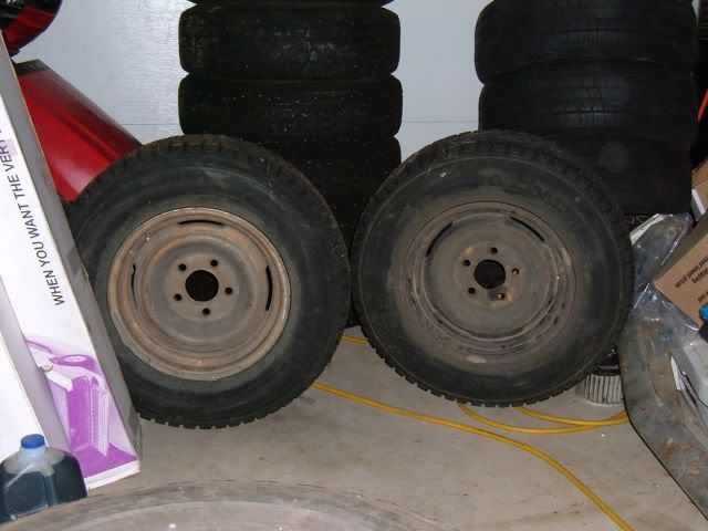 2- 235/75/15 in usable shape mounted on 15x7 rims with 5-lug 5" bolt pattern. Probably best used as winter-time spares. They are a matching tread but as far as I can tell they are different brands. The studs are about 50% there. Sell for $25.