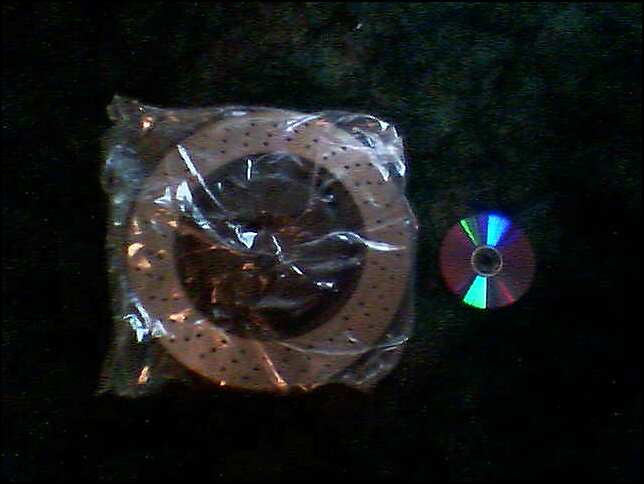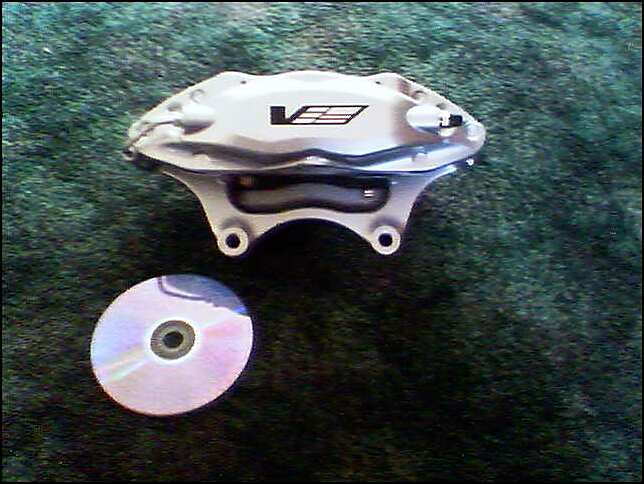 Here are the rotor and caliper, next to a CD for some size comparison.