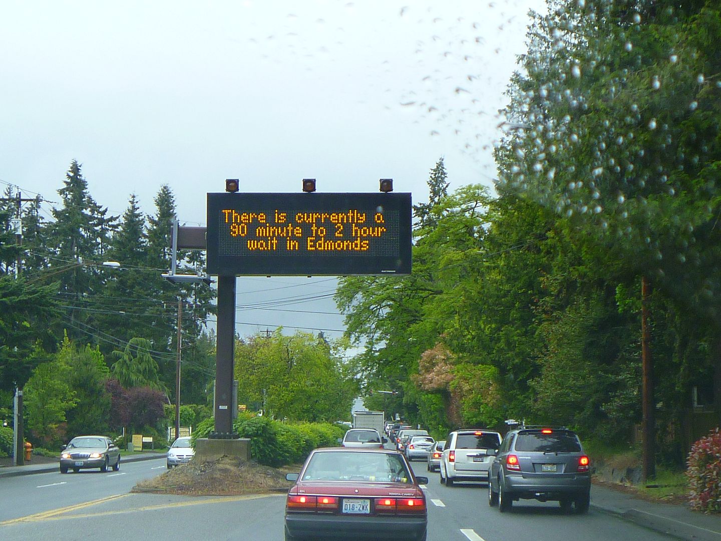 From this sign, it is 2 miles to the ferry, the cars in the right lane are in line and stopped - all waiting to board the ferry. This is more than 2 hours.