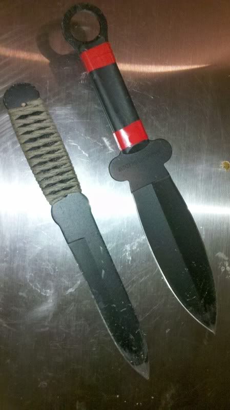 So a few weeks ago my friend watched The Expendables for the first time, he commented how he always wanted to throw knives. So he went and picked up a set of cheappy knives, and we started throwing, Well I took to it quick like and bought a couple sets, I learned my lesson about off brands and got a crash course on carbon content, heat treatments, and all the other fun scientific junk. So I picked up a varity of Cold Steel stuff.