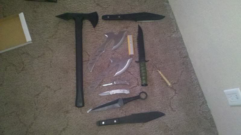 Here's the rest of the fleet I got last week. All of the axes are throwing ones, and all the black knives (minus the camo grip one) are throwers, and one second up from the bottom is a replica from the expendables.