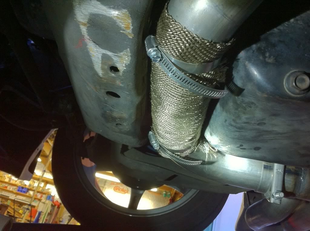 Underneath I was able to tuck up the down pipes to gain better than stock ground clearance . I'm pretty excited about this because with my ride height I need all I can get. It was half the reason why I went with the dual cat down pipes rather than the single pipe. The other reason is because it will make it a lot easier for me to convert to true duals down the road. I also wrapped the down pipe where it crosses under the oil pan to try and reduce oil temperature.
