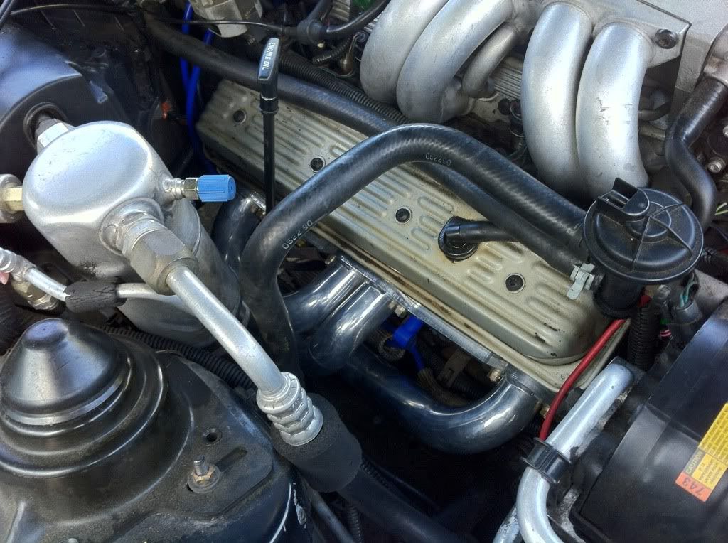 The passenger side was a bit tricky to get in there. I ended up being able to slide it in from the top but I had to remove the spark plugs, dip stick tube, unbolt the little bracket that holds the coolant hard line to the frame rail so I could bend it out of the way, and I had to stress the A/C box just enough to slide the header in there.